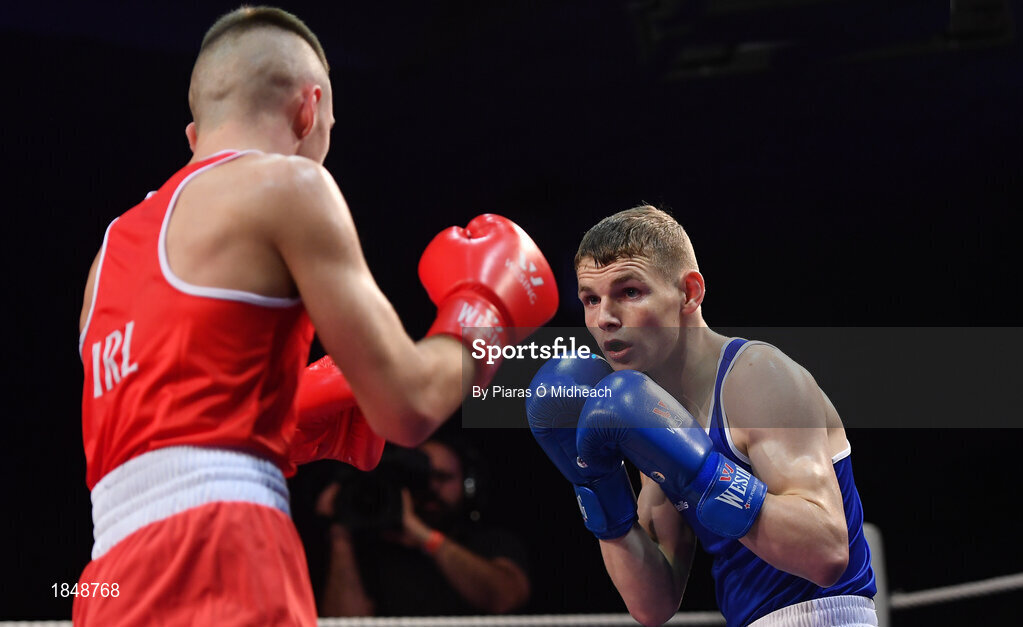 22 November 2019; Brandon McCarthy of St Michael's Athy, Co Kildare, right, in action against Barry McReynolds of Holy Trinity, Co Antrim, in their 60kg bout during the IABA Irish National Elite Boxing Championships Finals at the National Stadium in Dublin. Photo by Piaras Ó Mídheach/Sportsfile