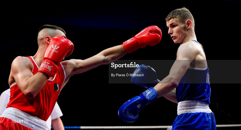 22 November 2019; Brandon McCarthy of St Michael's Athy, Co Kildare, right, in action against Barry McReynolds of Holy Trinity, Co Antrim, in their 60kg bout during the IABA Irish National Elite Boxing Championships Finals at the National Stadium in Dublin. Photo by Piaras Ó Mídheach/Sportsfile