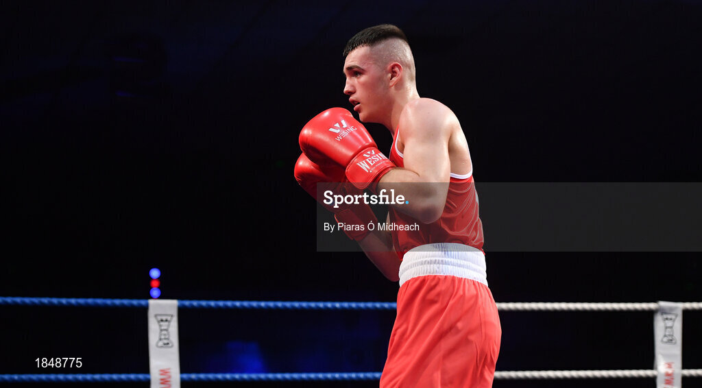22 November 2019; Barry McReynolds of Holy Trinity, Co Antrim, during the 60kg bout against Brandon McCarthy of St Michael's Athy, Co Kildare, during the IABA Irish National Elite Boxing Championships Finals at the National Stadium in Dublin. Photo by Piaras Ó Mídheach/Sportsfile
