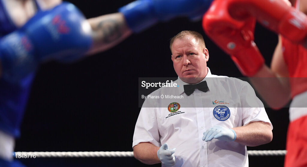 22 November 2019; Referee Sergeant Stephen Kelly looks on as Barry McReynolds of Holy Trinity, Co Antrim, takes on Brandon McCarthy of St Michael's Athy, Co Kildare, in their 60kg bout during the IABA Irish National Elite Boxing Championships Finals at the National Stadium in Dublin. Photo by Piaras Ó Mídheach/Sportsfile