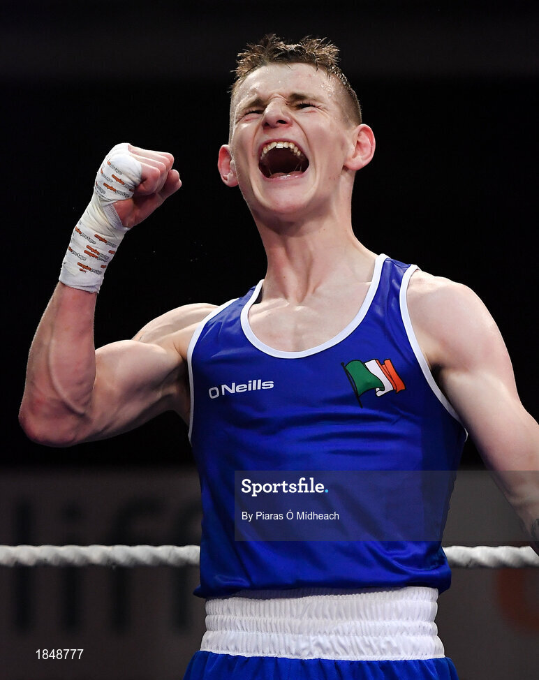 22 November 2019; Brandon McCarthy of St Michael's Athy, Co Kildare, celebrates beating Barry McReynolds of Holy Trinity, Co Antrim, in their 60kg bout during the IABA Irish National Elite Boxing Championships Finals at the National Stadium in Dublin. Photo by Piaras Ó Mídheach/Sportsfile