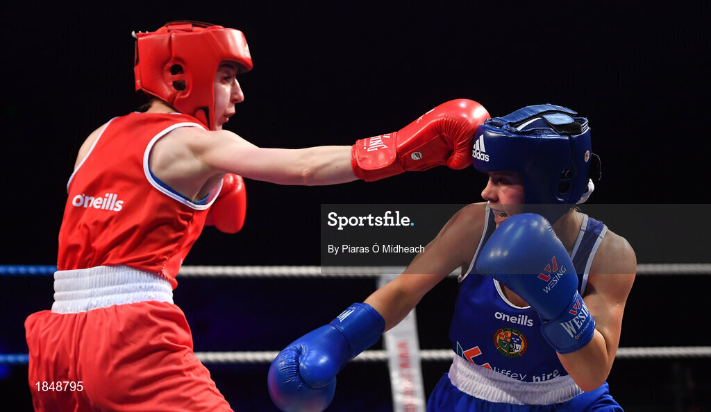22 November 2019; Shannon Sweeney of St Annes, Co Mayo, left, in action against Daina Moorehouse of Enniskerry, Co Wicklow, in their 48kg bout during the IABA Irish National Elite Boxing Championships Finals at the National Stadium in Dublin. Photo by Piaras Ó Mídheach/Sportsfile