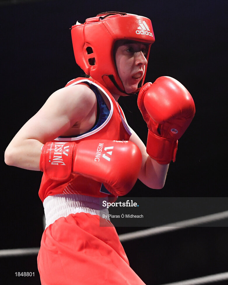 22 November 2019; Shannon Sweeney of St Annes, Co Mayo, during the 48kg bout against Daina Moorehouse of Enniskerry, Co Wicklow, during the IABA Irish National Elite Boxing Championships Finals at the National Stadium in Dublin. Photo by Piaras Ó Mídheach/Sportsfile