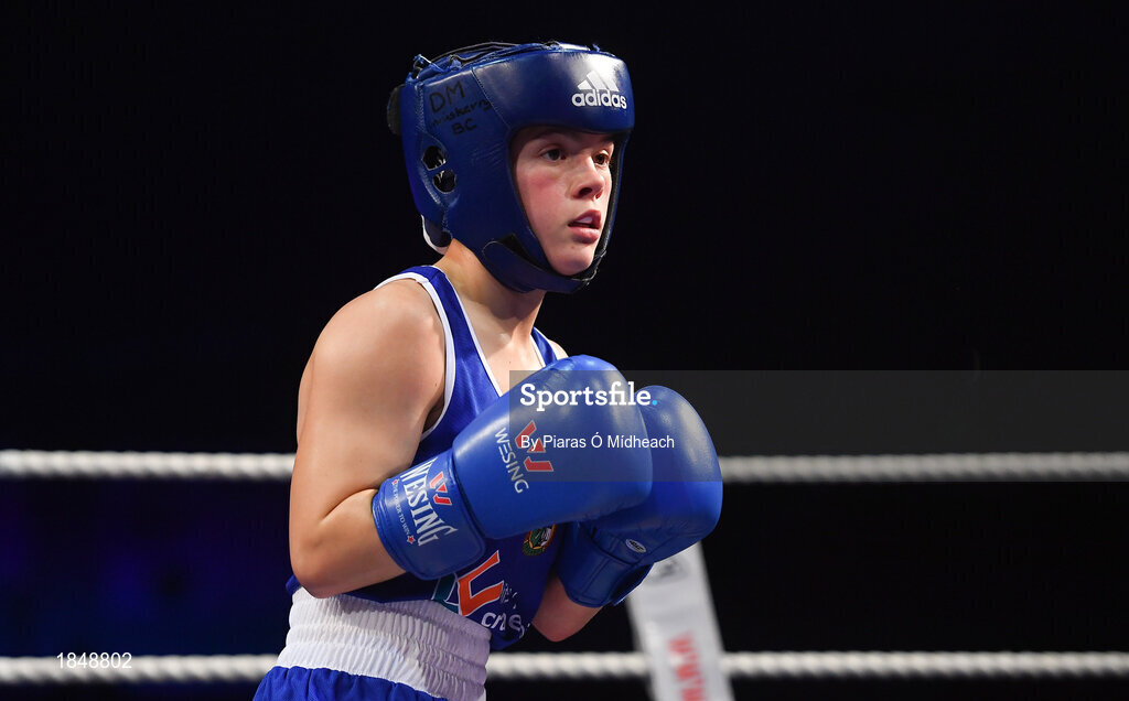 22 November 2019; Daina Moorehouse of Enniskerry, Co Wicklow, during the 48kg bout against Shannon Sweeney of St Annes, Co Mayo, during the IABA Irish National Elite Boxing Championships Finals at the National Stadium in Dublin. Photo by Piaras Ó Mídheach/Sportsfile