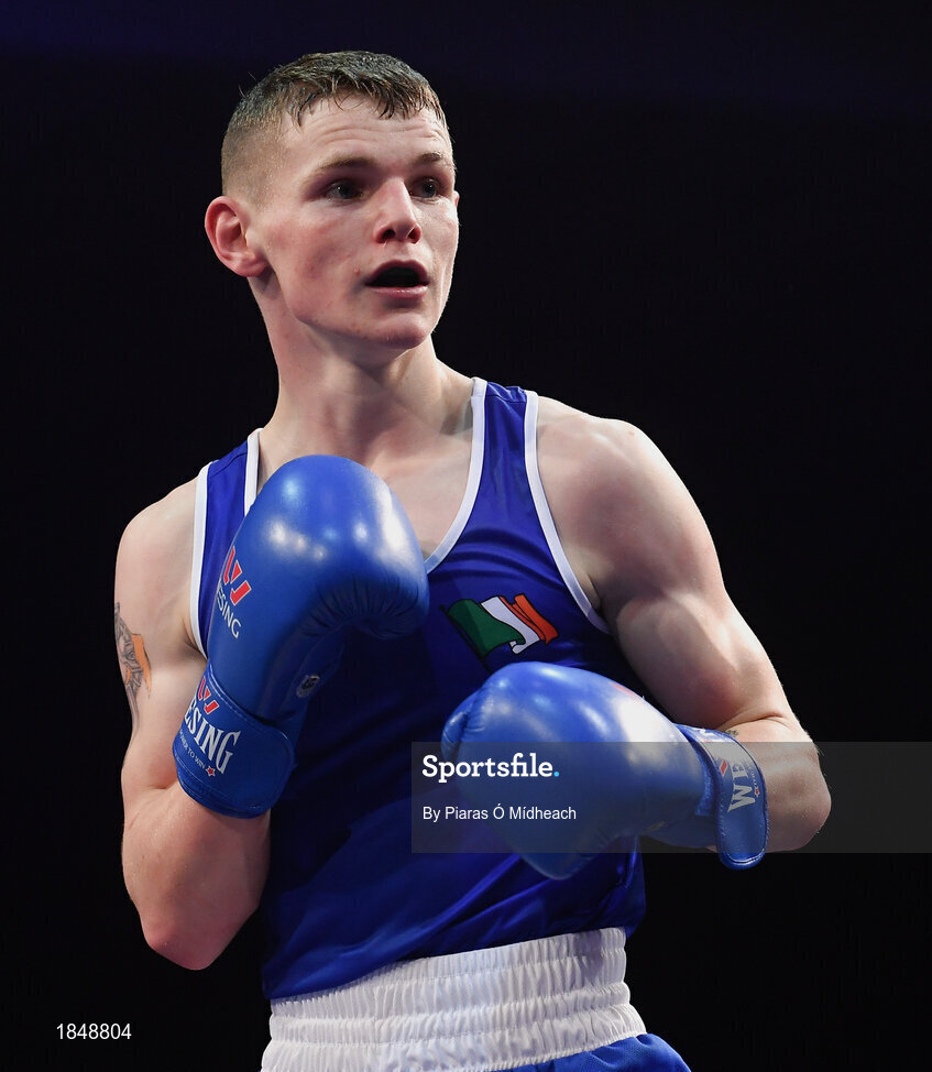 22 November 2019; Brandon McCarthy of St Michael's Athy, Co Kildare, during the 60kg bout against Barry McReynolds of Holy Trinity, Co Antrim, during the IABA Irish National Elite Boxing Championships Finals at the National Stadium in Dublin. Photo by Piaras Ó Mídheach/Sportsfile