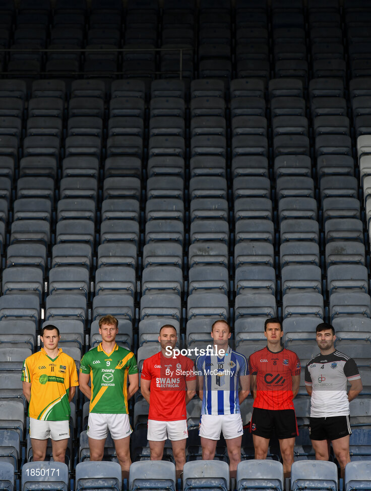 28 November 2019; Footballers, from left, Philly Garry of Clann na nGael, Matthew Cody of Rathgarogue Cushinstown, Jordan Lowry of Éire Óg, Darren O’Reilly of Ballyboden St Enda's, Adrian Reid of Mattock Rangers and Mickey Jones of Mullinavat during the launch of the AIB Leinster GAA Club Finals at MW Hire O'Moore Park in Portlaoise, Co Laois. Photo by Stephen McCarthy/Sportsfile