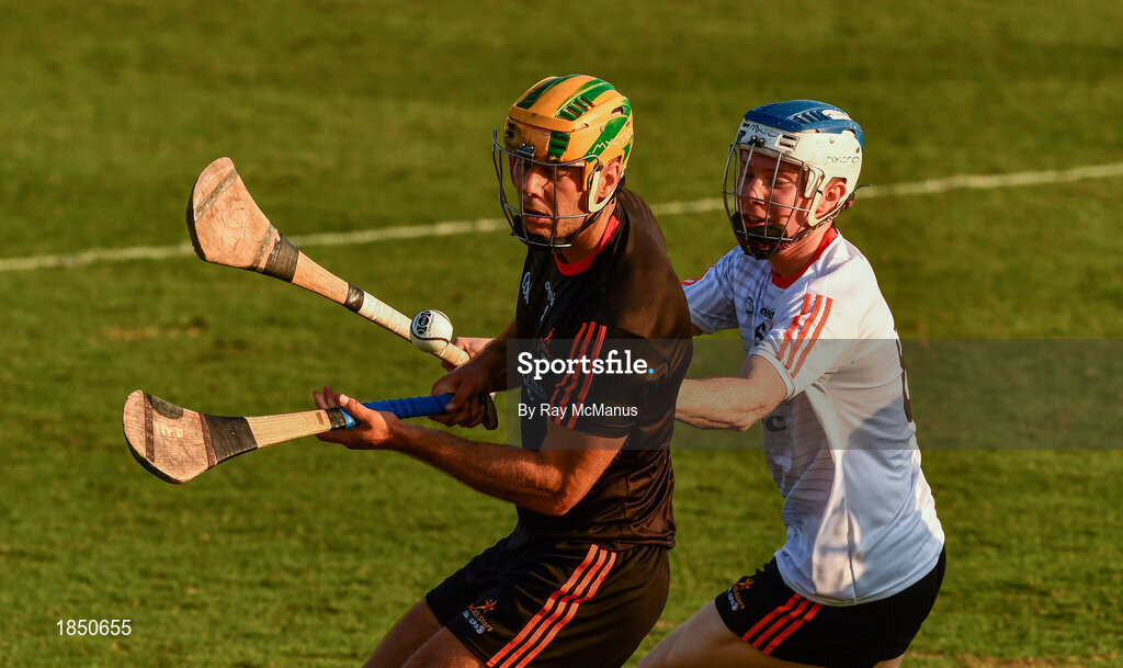 29 November 2019; Limerick's Dan Morrissey of 2018 PwC All-Star in action against Sligo's James Weir of 2019 PwC All-Star during the PwC All Star Hurling Tour 2019 All Star game at Zayed Sport City in Abu Dhabi, United Arab Emirates. Photo by Ray McManus/Sportsfile