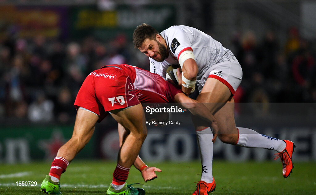 29 November 2019; Stuart McCloskey of Ulster is tackled by Corey Baldwin of Scarlets during the Guinness PRO14 Round 7 match between Ulster and Scarlets at the Kingspan Stadium in Belfast. Photo by Ramsey Cardy/Sportsfile