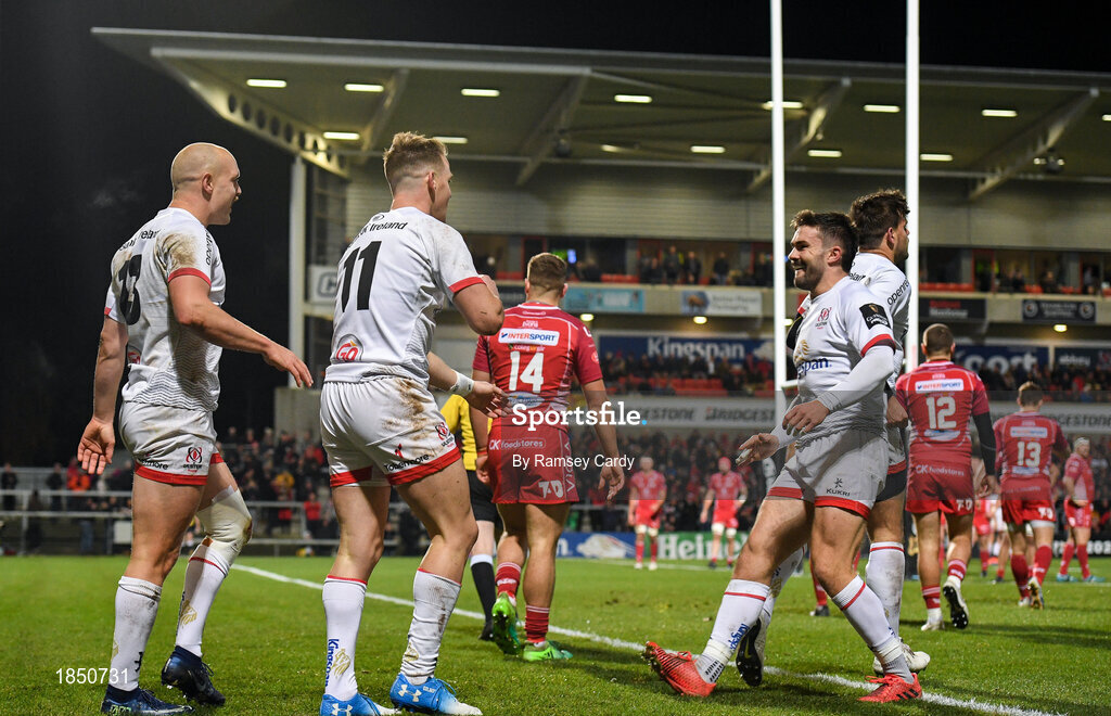 29 November 2019; Ulster's Matt Faddes, left, celebrates with team-mates after scoring his side's first try during the Guinness PRO14 Round 7 match between Ulster and Scarlets at the Kingspan Stadium in Belfast. Photo by Ramsey Cardy/Sportsfile