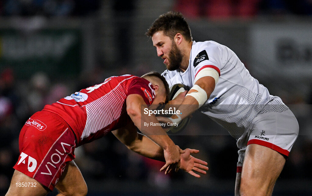 29 November 2019; Stuart McCloskey of Ulster is tackled by Corey Baldwin of Scarlets during the Guinness PRO14 Round 7 match between Ulster and Scarlets at the Kingspan Stadium in Belfast. Photo by Ramsey Cardy/Sportsfile