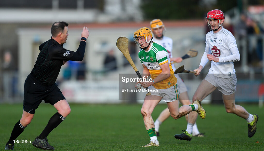 30 November 2019; Liam Langton of Offaly gets past James Burke of Kildare as referee David Hughes gets out of the way during the Kehoe Cup Round 1 match between Offaly and Kildare at St Brendan's Park in Birr, Co Offaly. Photo by Piaras Ó Mídheach/Sportsfile
