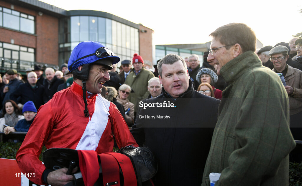 1 December 2019; Jockey Davy Russell, left, speaks with trainer Gordon Elliott and representative owner Chris Hitchens after sending out Evoi Allen to win the BARONERACING.COM Royal Bond Novice Hurdle on Day 2 of the Fairyhouse Winter Festival at Fairyhouse Racecourse in Meath. Photo by Harry Murphy/Sportsfile