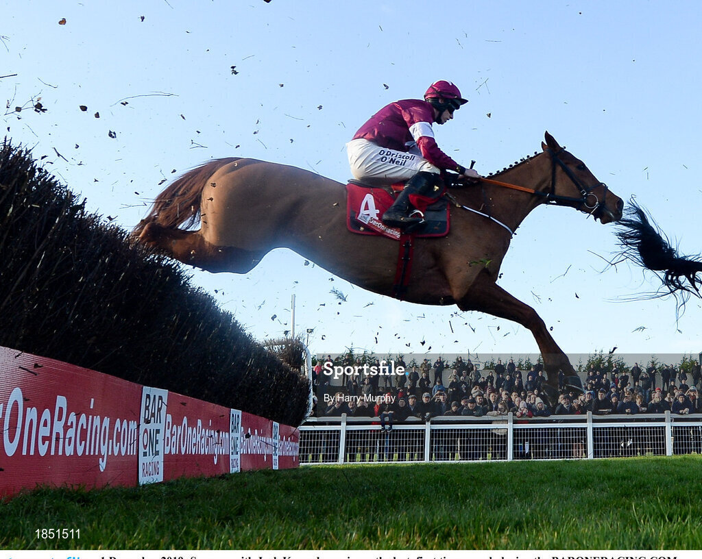 1 December 2019; Samcro, with Jack Kennedy up, jump the last, first time round, during the BARONERACING.COM Drinmore Novice Steeplechase on Day 2 of the Fairyhouse Winter Festival at Fairyhouse Racecourse in Meath. Photo by Harry Murphy/Sportsfile