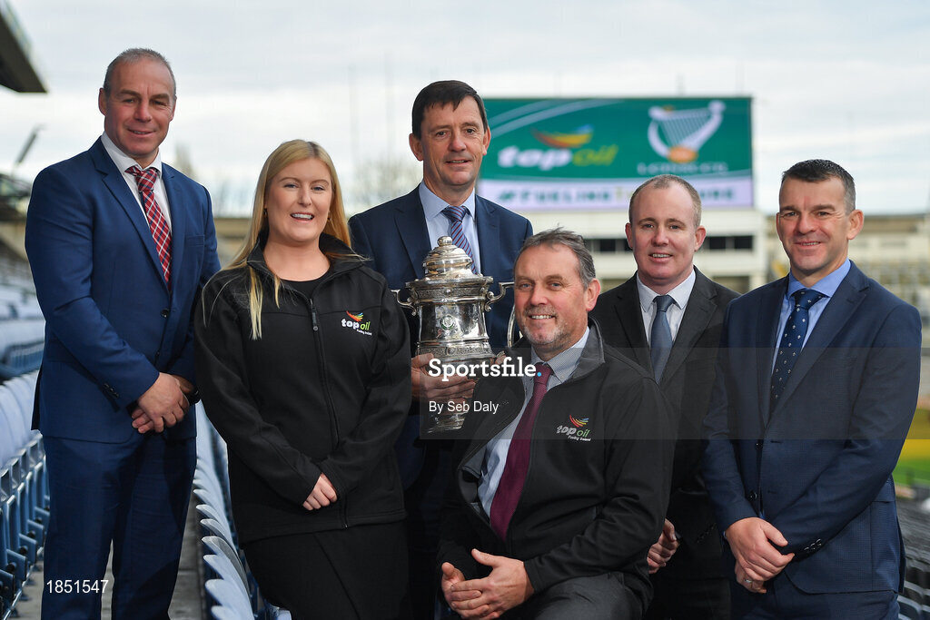2 December 2019; Top Oil representatives, from left, Charlie Carter, Louise Hyland, Andrew Meagher, Noel Manning, Mark Phelan and James Fitzgerland during the Top Oil Leinster GAA Post Primary Schools Hurling Launch at Croke Park in Dublin. Photo by Seb Daly/Sportsfile
