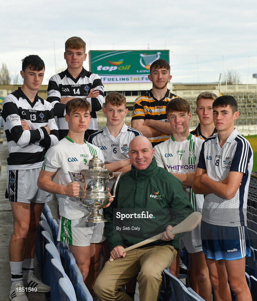 2 December 2019; Former Kilkenny hurler and Competition Ambassador DJ Carey, centre, is joined by players from participating schools and colleges, from left, Conor Kelly and Ciarán Brennan of St Kieran’s College, Kilkenny, Zac Firman of St Peter’s College, Wexford, Brian Dunne of North Dublin Colleges, Iain Ó hEithir of Coláiste Eoin, Booterstown, Dublin, Conor Mahoney of St Peter’s College, Wexford, Brian Mac Síthigh of Coláiste Eoin, Booterstown, Dublin, and Paddy Doyle of North Dublin Colleges, during the Top Oil Leinster GAA Post Primary Schools Hurling Launch at Croke Park in Dublin. Photo by Seb Daly/Sportsfile