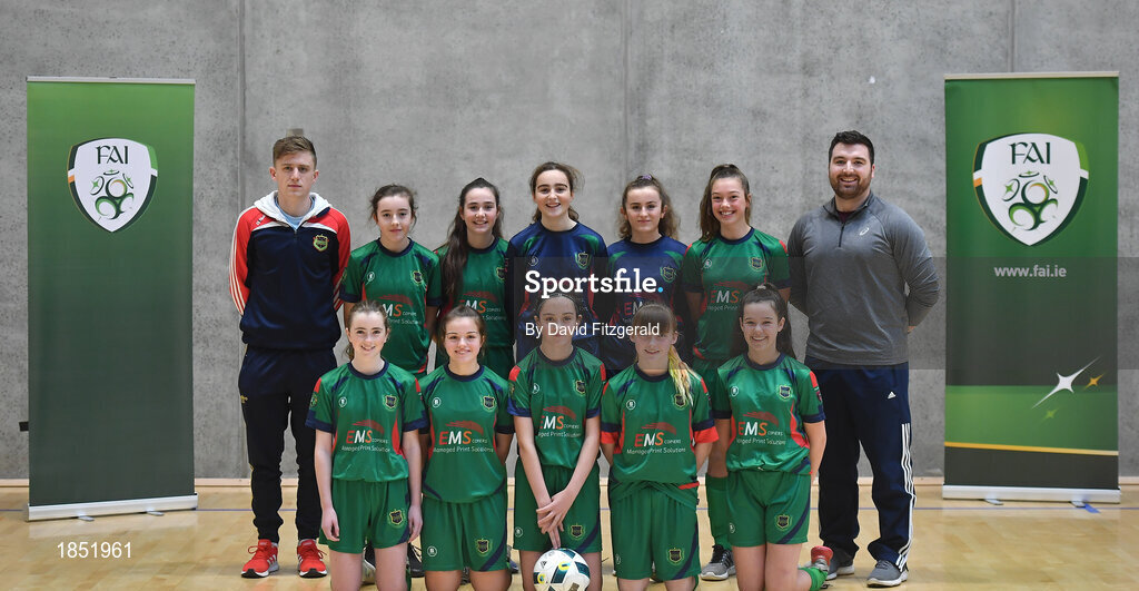 5 December 2019; The players and coaches of Presentation Secondary School, Co Wexford, prior to the FAI Post Primary Schools Futsal National Finals in the WIT Arena, Waterford United. Photo by David Fitzgerald/Sportsfile