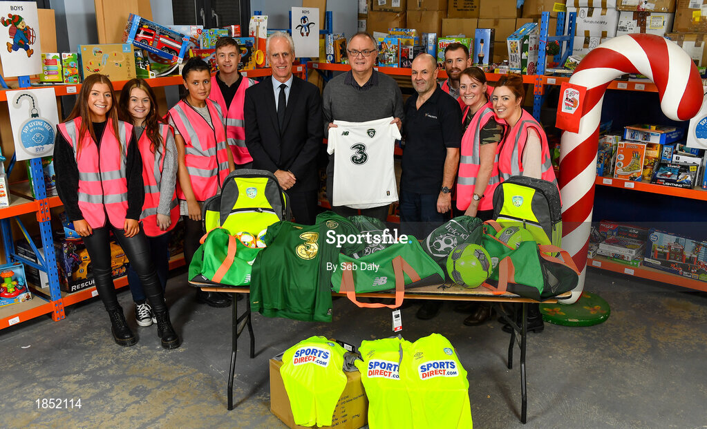 8 December 2019; Republic of Ireland manager Mick McCarthy was on hand today to hand over Republic of Ireland bags filled with jerseys, footballs, scarfs & other merchandise to Liam Casey, centre, East Region President, St Vincent De Paul, at the St Vincent De Paul depot on Sean McDermott Street, Summerhill, Dublin. The gifts are part of an annual Christmas donation for families in need. Pictured are Republic of Ireland manager Mick McCarthy, Liam Casey, East Region President, St Vincent De Paul, and corporate volunteers from Electric Ireland, at the St Vincent De Paul depot on Sean McDermott Street, Summerhill, Dublin. Photo by Seb Daly/Sportsfile