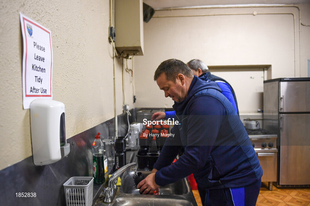 7 December 2019; Murt Kelly fills Laois water bottles prior to the 2020 O'Byrne Cup Round 1 match between Laois and Offaly at McCann Park in Portarlington, Co Laois. Photo by Harry Murphy/Sportsfile