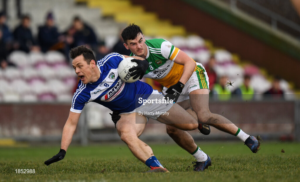 7 December 2019; John O'Loughlin of Laois in action against Eoin Carroll of Offaly during the 2020 O'Byrne Cup Round 1 match between Laois and Offaly at McCann Park in Portarlington, Co Laois. Photo by Harry Murphy/Sportsfile