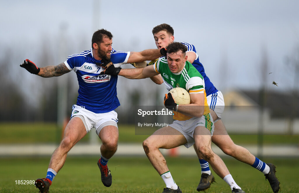 7 December 2019; Jordan Hayes of Offaly in action against Jason Moore, left, and Diarmuid Whelan of Laois during the 2020 O'Byrne Cup Round 1 match between Laois and Offaly at McCann Park in Portarlington, Co Laois. Photo by Harry Murphy/Sportsfile