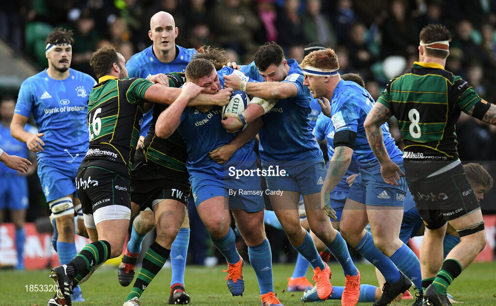 7 December 2019; Tadhg Furlong of Leinster is tackled by Tom Wood of Northampton Saints during the Heineken Champions Cup Pool 1 Round 3 match between Northampton Saints and Leinster at Franklins Gardens in Northampton, England. Photo by Ramsey Cardy/Sportsfile