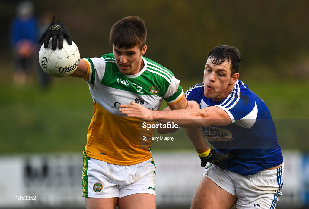 7 December 2019; Cathal Mangan of Offaly in action against John O'Loughlin of Laois during the 2020 O'Byrne Cup Round 1 match between Laois and Offaly at McCann Park in Portarlington, Co Laois. Photo by Harry Murphy/Sportsfile