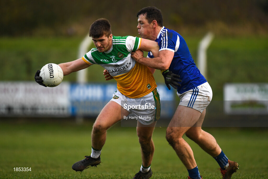 7 December 2019; Cathal Mangan of Offaly in action against John O'Loughlin of Laois during the 2020 O'Byrne Cup Round 1 match between Laois and Offaly at McCann Park in Portarlington, Co Laois. Photo by Harry Murphy/Sportsfile
