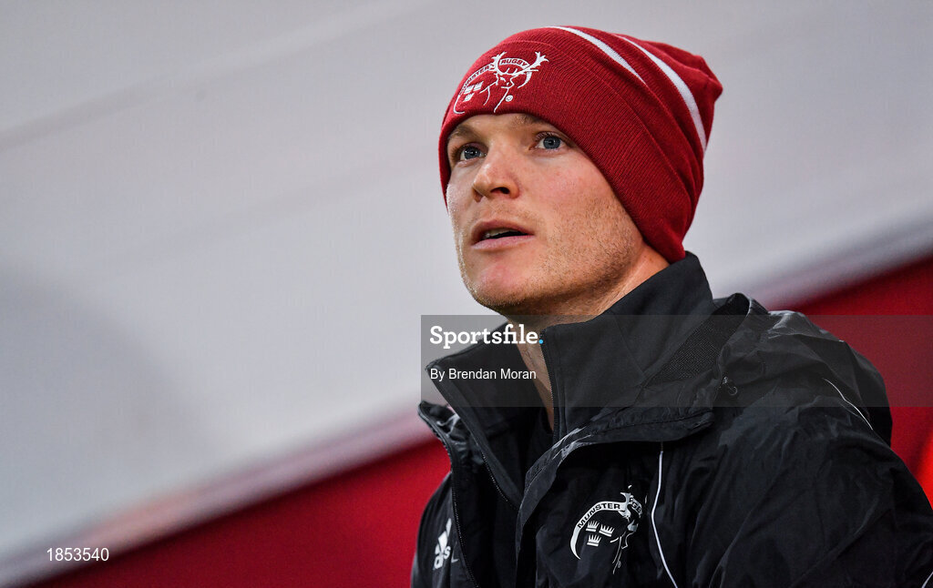 7 December 2019; Injured Munster player Tyler Bleyendaal looks on ahead of the Heineken Champions Cup Pool 4 Round 3 match between Munster and Saracens at Thomond Park in Limerick. Photo by Brendan Moran/Sportsfile