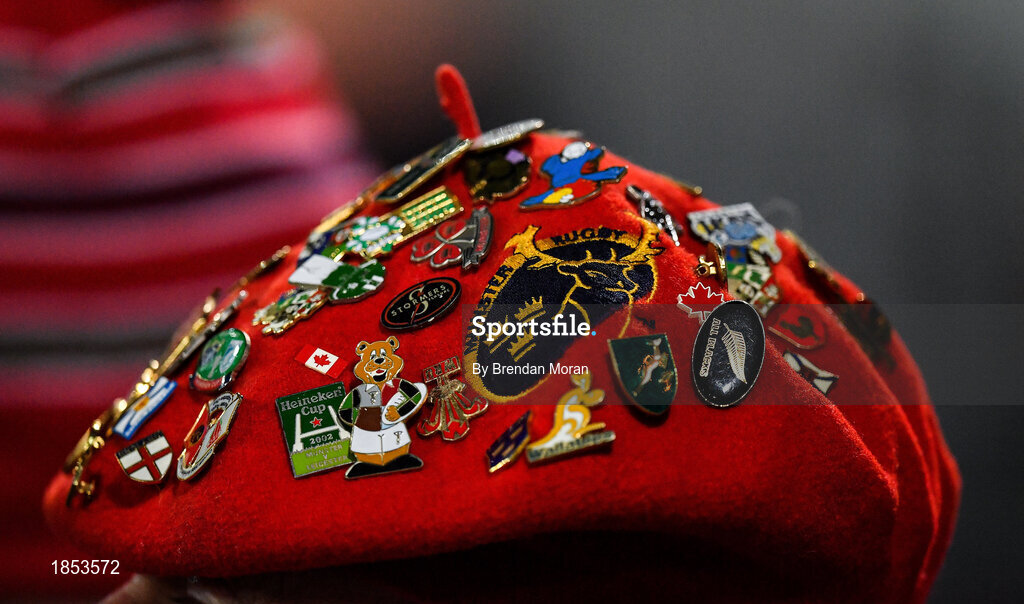 7 December 2019; The hat of a Munster supporter is seen with badges from other clubs around Europe ahead of the Heineken Champions Cup Pool 4 Round 3 match between Munster and Saracens at Thomond Park in Limerick. Photo by Brendan Moran/Sportsfile