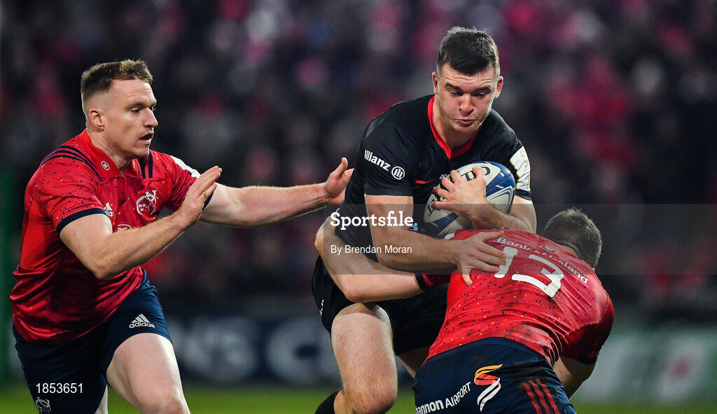 7 December 2019; Matt Gallagher of Saracens is tackled by Rory Scannell and Chris Farrell of Munster during the Heineken Champions Cup Pool 4 Round 3 match between Munster and Saracens at Thomond Park in Limerick. Photo by Brendan Moran/Sportsfile