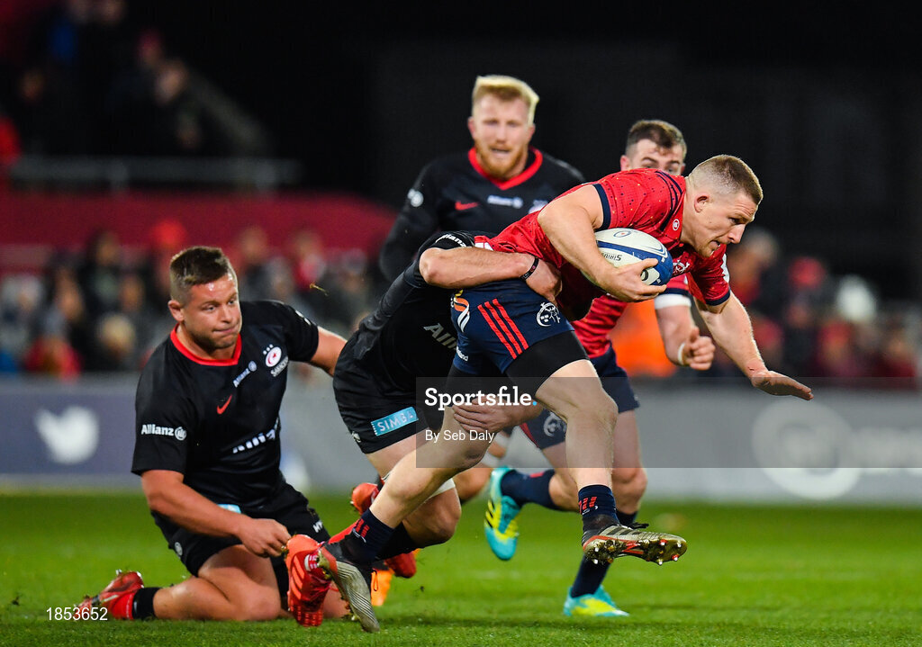 7 December 2019; Andrew Conway of Munster is tackled by Ben Earl of Saracens during the Heineken Champions Cup Pool 4 Round 3 match between Munster and Saracens at Thomond Park in Limerick. Photo by Seb Daly/Sportsfile