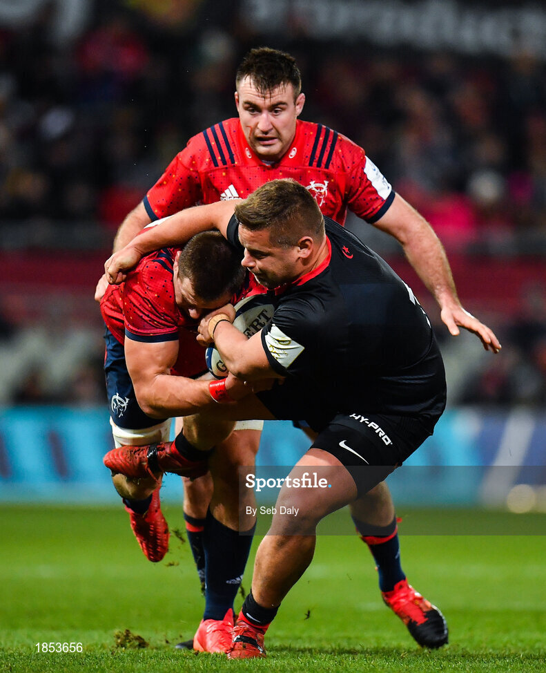 7 December 2019; CJ Stander of Munster is tackled by Richard Barrington of Saracens during the Heineken Champions Cup Pool 4 Round 3 match between Munster and Saracens at Thomond Park in Limerick. Photo by Seb Daly/Sportsfile