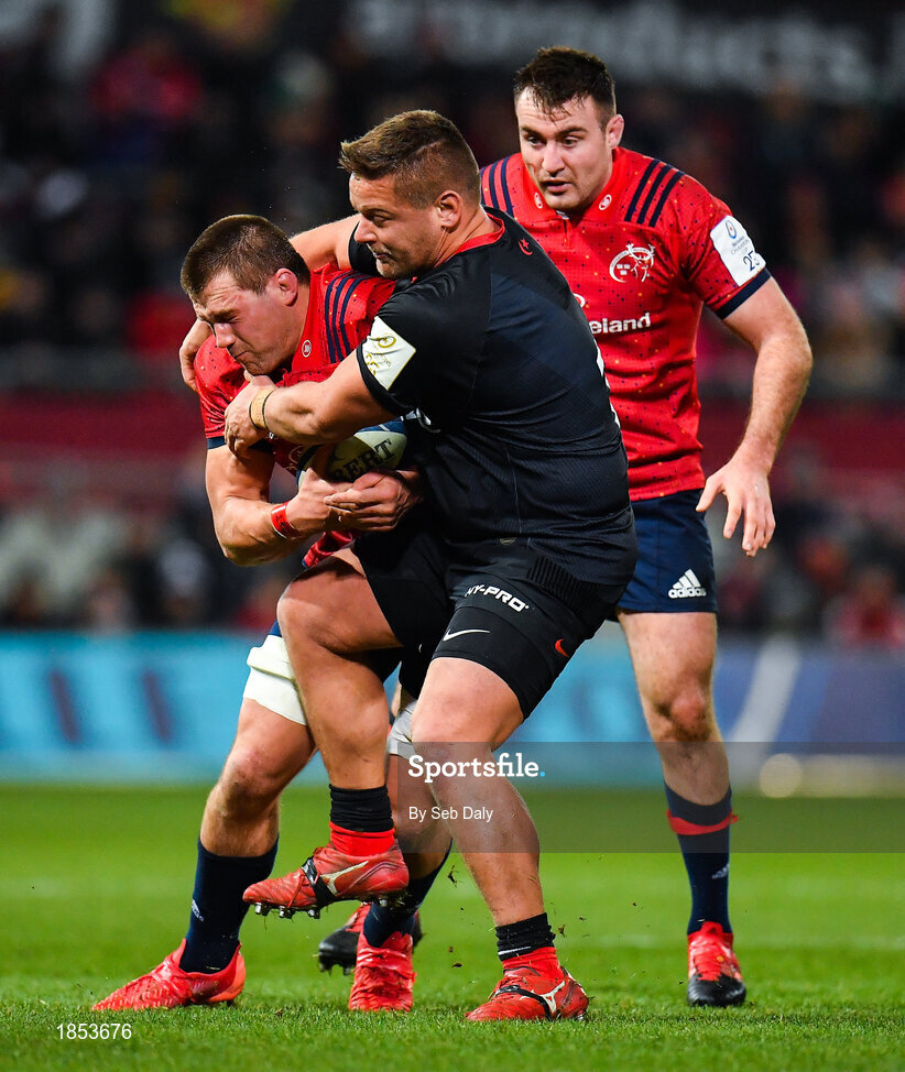 7 December 2019; CJ Stander of Munster is tackled by Richard Barrington of Saracens during the Heineken Champions Cup Pool 4 Round 3 match between Munster and Saracens at Thomond Park in Limerick. Photo by Seb Daly/Sportsfile