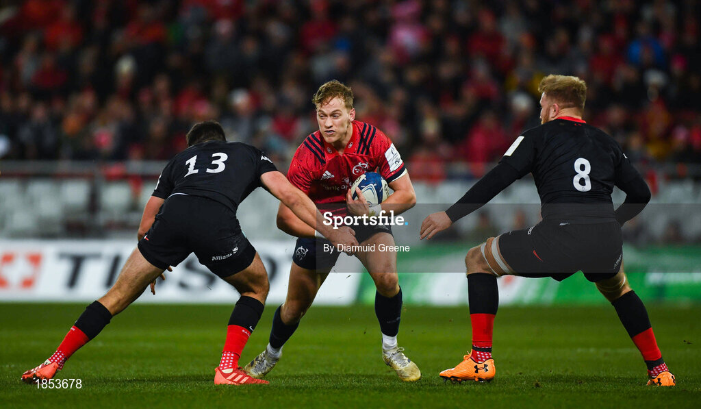 7 December 2019; Mike Haley of Munster is tackled by Alex Lozowski and Jackson Wray of Saracens during the Heineken Champions Cup Pool 4 Round 3 match between Munster and Saracens at Thomond Park in Limerick. Photo by Diarmuid Greene/Sportsfile