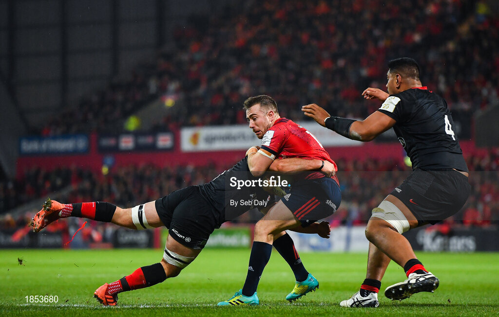 7 December 2019; JJ Hanrahan of Munster is tackled by Ben Earl, left, and Will Skelton of Saracens during the Heineken Champions Cup Pool 4 Round 3 match between Munster and Saracens at Thomond Park in Limerick. Photo by Seb Daly/Sportsfile