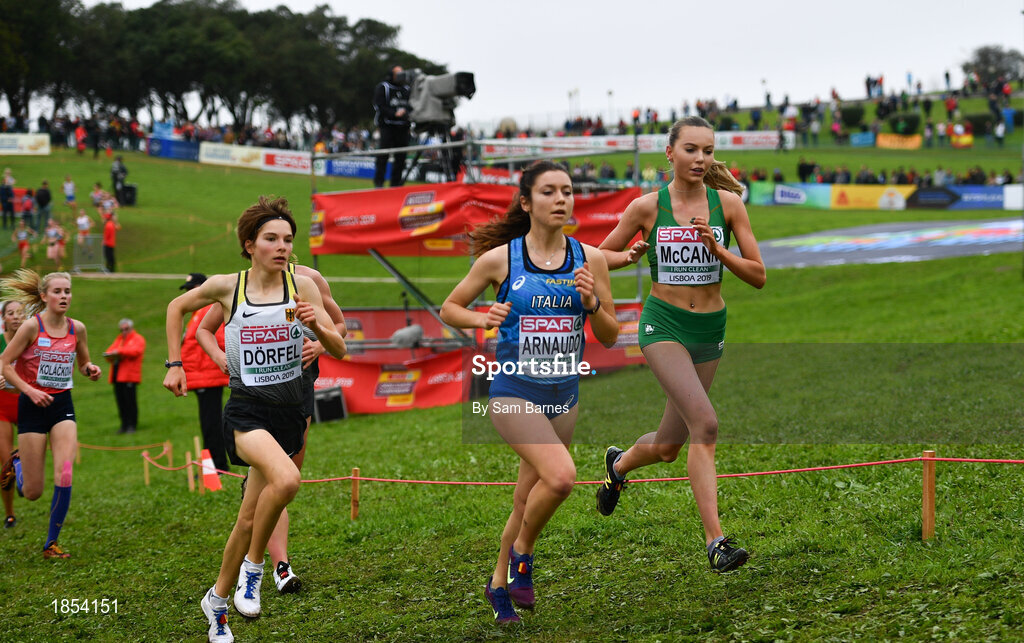 8 December 2019; Jodie McCann of Ireland, left, competing in the Women's U20 event competing during the European Cross Country Championships 2019 at Bela Vista Park in Lisbon, Portugal. Photo by Sam Barnes/Sportsfile
