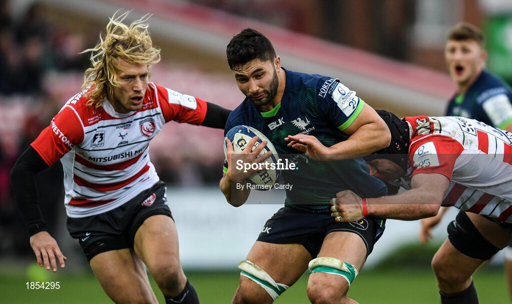 8 December 2019; Colby Fainga'a of Connacht is tackled by Billy Twelvetrees, left, and Ben Morgan of Gloucester during the Heineken Champions Cup Pool 5 Round 3 match between Gloucester and Connacht at Kingsholm Stadium in Gloucester, England. Photo by Ramsey Cardy/Sportsfile