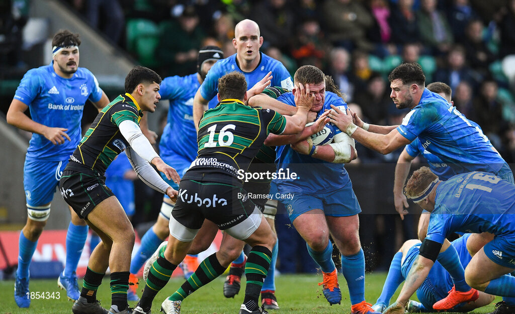 7 December 2019; Tadhg Furlong of Leinster is tackled by Michael van Vuuren of Northampton Saints during the Heineken Champions Cup Pool 1 Round 3 match between Northampton Saints and Leinster at Franklins Gardens in Northampton, England. Photo by Ramsey Cardy/Sportsfile