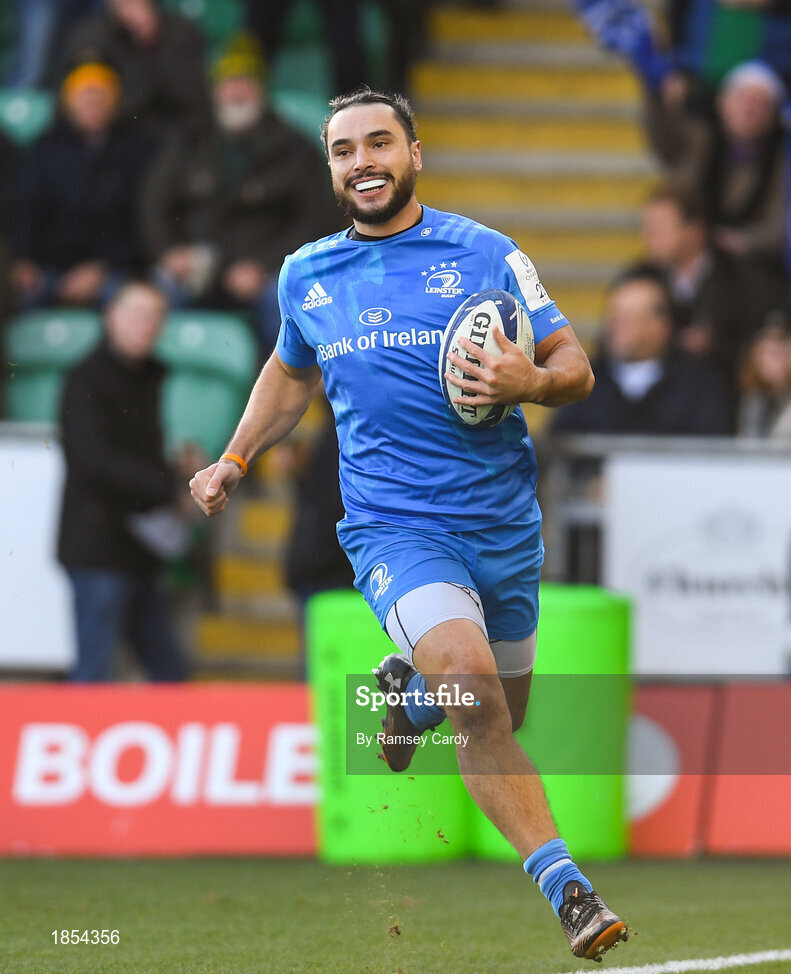 7 December 2019; James Lowe of Leinster on his way to scoring his side's first try during the Heineken Champions Cup Pool 1 Round 3 match between Northampton Saints and Leinster at Franklins Gardens in Northampton, England. Photo by Ramsey Cardy/Sportsfile
