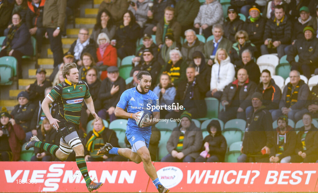 7 December 2019; James Lowe of Leinster on his way to scoring his side's first try during the Heineken Champions Cup Pool 1 Round 3 match between Northampton Saints and Leinster at Franklins Gardens in Northampton, England. Photo by Ramsey Cardy/Sportsfile