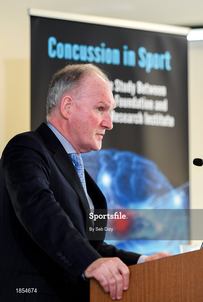 9 December 2019; Former Irish Jockey Ruby Walsh was on hand today to help launch ground-breaking new research to understand long term impact of concussion on athletes. New research will explore the long-term effects of repeated concussion and head injuries on those who have competed in contact sports. The research, ‘Concussion in Sport’, launched today as a collaboration between Beacon Hospital Research Institute and the International Concussion and Head Injury Research Foundation (ICHIRF), will allow for better management of concussions in the future. The project will initially recruit retired jockeys and will then expand to other contact sports such as rugby, GAA, boxing and soccer. They will be asked to complete an online questionnaire annually and to attend Beacon Hospital for screening. Pictured speaking is Dr Adrian McGoldrick, Trustee, ICHIRF, during the launch of the Concussion in Sport Study at Beacon Hospital in Sandyford, Dublin. Photo by Seb Daly/Sportsfile