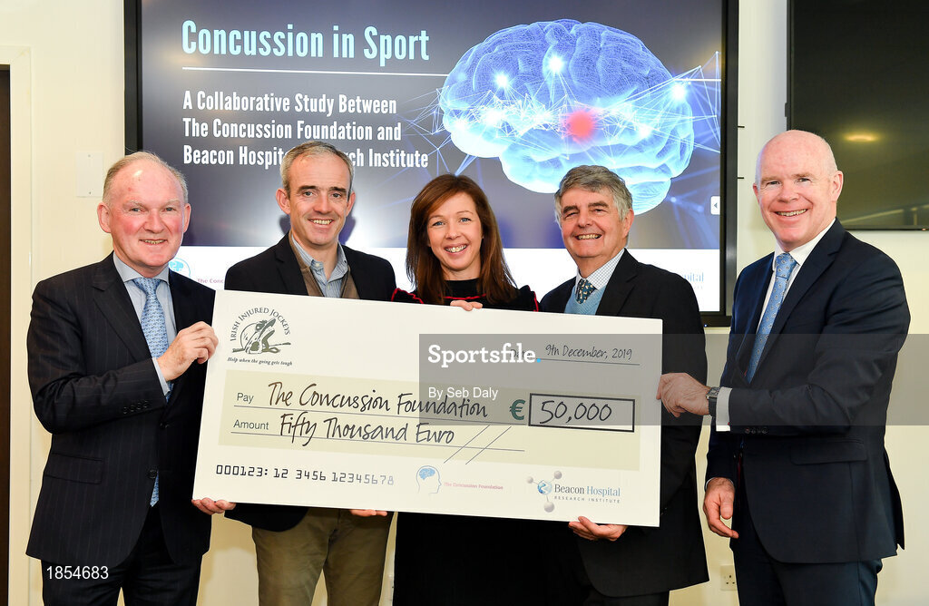 9 December 2019; Former Irish Jockey Ruby Walsh was on hand today to help launch ground-breaking new research to understand long term impact of concussion on athletes. New research will explore the long-term effects of repeated concussion and head injuries on those who have competed in contact sports. The research, ‘Concussion in Sport’, launched today as a collaboration between Beacon Hospital Research Institute and the International Concussion and Head Injury Research Foundation (ICHIRF), will allow for better management of concussions in the future. The project will initially recruit retired jockeys and will then expand to other contact sports such as rugby, GAA, boxing and soccer. They will be asked to complete an online questionnaire annually and to attend Beacon Hospital for screening. Pictured are, from left, Dr Adrian McGoldrick, Trustee, ICHIRF, former Irish jockey Ruby Walsh, Dr Jennifer Pugh, Irish Horseracing Regulatory Board, Dr Michael Turner, CEO & Medical Director, ICHIRF, and Michael Cullen, CEO, Beacon Hospital, during the launch of the Concussion in Sport Study at Beacon Hospital in Sandyford, Dublin. Photo by Seb Daly/Sportsfile