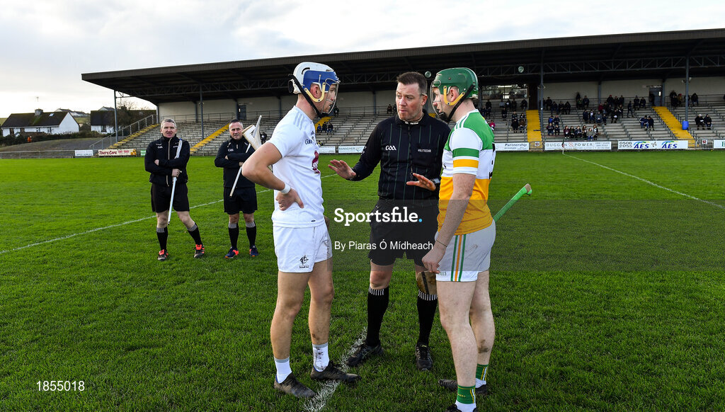 30 November 2019; Referee David Hughes with team captains Jack Sheridan of Kildare and Damien Egan of Offaly before the Kehoe Cup Round 1 match between Offaly and Kildare at St Brendan's Park in Birr, Co Offaly. Photo by Piaras Ó Mídheach/Sportsfile
