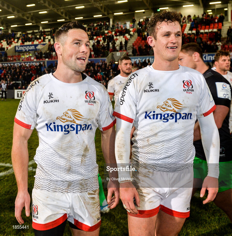 7 December 2019; John Cooney and Billy Burns of Ulster after the Heineken Champions Cup Pool 3 Round 3 match between Ulster and Harlequins at Kingspan Stadium in Belfast. Photo by Oliver McVeigh/Sportsfile