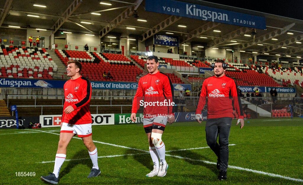 22 November 2019; Jordi Murphy, Marcell Coetzee and Sean Reidy of Ulster before the Heineken Champions Cup Pool 3 Round 2 match between Ulster and ASM Clermont Auvergne at Kingspan Stadium in Belfast. Photo by Oliver McVeigh/Sportsfile