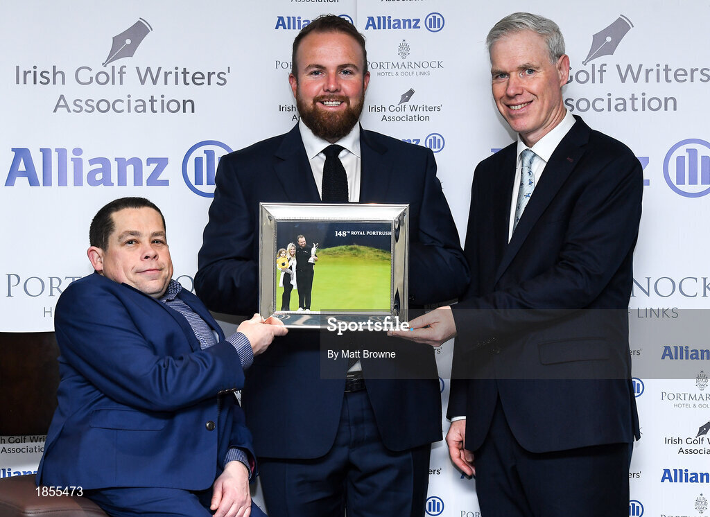 12 December 2019; Shane Lowry is presented with the Professional Player of the Year award for 2019 by Paul Kelly, Chairman of the Irish Golf Writer’s Association, left, and Peter Kilcullen from Allianz during the 2019 Allianz Irish Golf Writers Association Awards at Portmarnock Hotel and Golf Links in Dublin. Photo by Matt Browne/Sportsfile