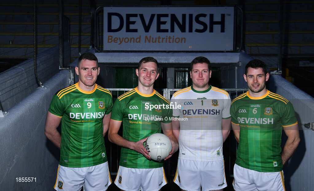 13 December 2019; Meath footballers, from left, Bryan Menton, Conor McGill, Andy Colgan, and Donal Keogan during the launch of the 2020 Meath GAA Jersey at Páirc Tailteann in Navan, Co Meath. Photo by Piaras Ó Mídheach/Sportsfile