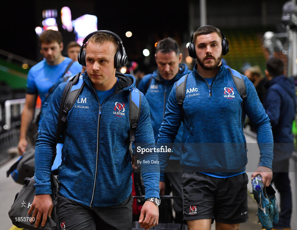 13 December 2019; Luke Marshall, left, and Adam McBurney of Ulster arrive prior to the Heineken Champions Cup Pool 3 Round 4 match between Harlequins and Ulster at Twickenham Stoop in London, England. Photo by Seb Daly/Sportsfile
