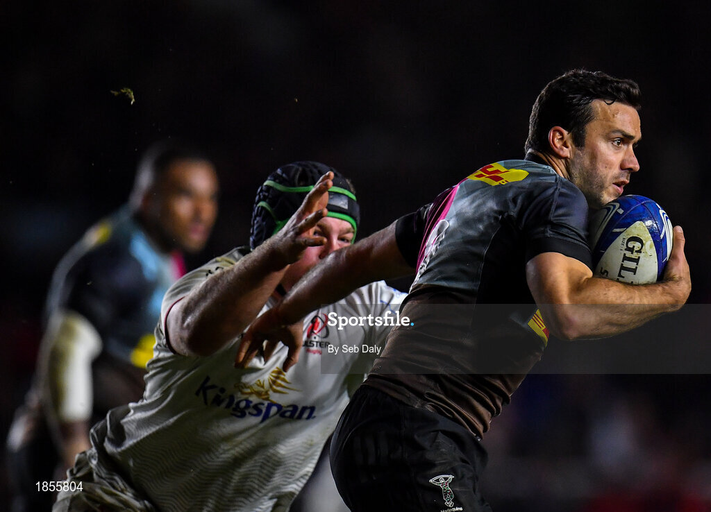 13 December 2019; Martin Landajo of Harlequins evades the tackle of Eric O'Sullivan of Ulster during the Heineken Champions Cup Pool 3 Round 4 match between Harlequins and Ulster at Twickenham Stoop in London, England. Photo by Seb Daly/Sportsfile