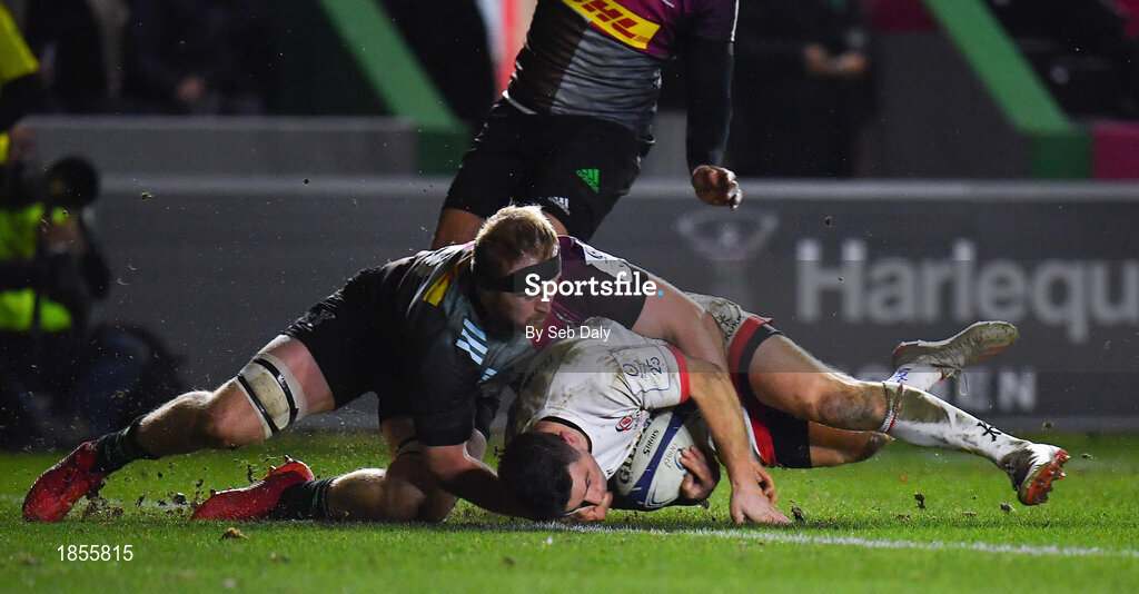 13 December 2019; John Cooney of Ulster dives over to score his side's first try, despite the tackle of James Chisholm of Harlequins, during the Heineken Champions Cup Pool 3 Round 4 match between Harlequins and Ulster at Twickenham Stoop in London, England. Photo by Seb Daly/Sportsfile
